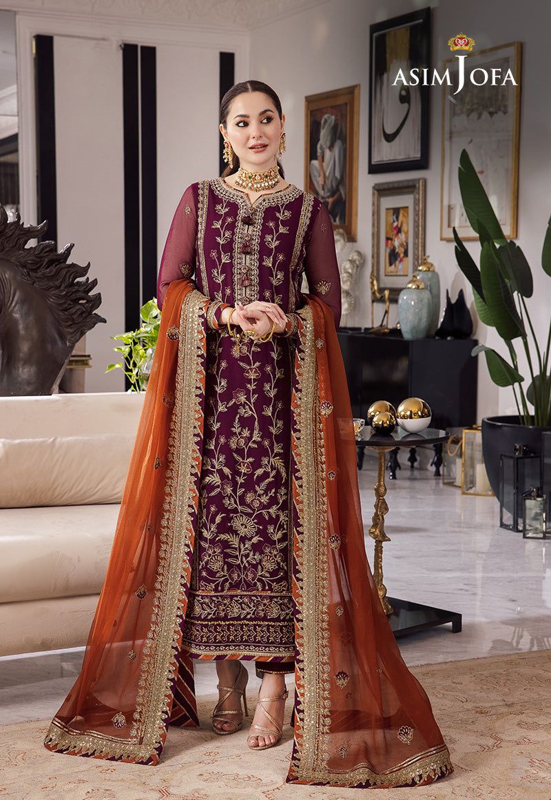 Asim Jofa Chiffon 3pc: Full Front & Sleeve Sequence Embroidery with Embroidered Daman Bunches